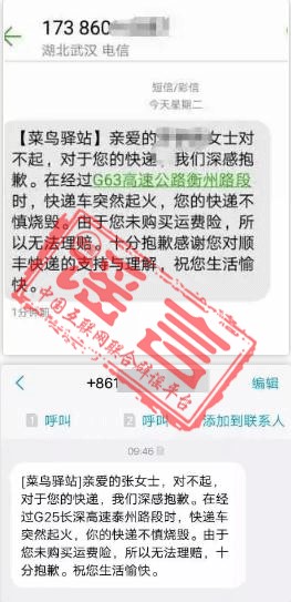 【傳言】“雙十一”過(guò)后,不少買(mǎi)家收到一條來(lái)自“菜鳥(niǎo)驛站”的短信,稱(chēng):快遞車(chē)起火、快遞被燒毀,并要求收件人點(diǎn)擊鏈接或回復(fù)電話進(jìn)行核實(shí)。