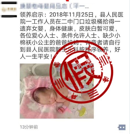 【傳言】11月底,云南、寧夏、河北、山西等地出現(xiàn)一則“領(lǐng)養(yǎng)啟事”。啟事的核心內(nèi)容是,某地醫(yī)護(hù)人員在二中門(mén)口垃圾桶拾得一遺棄女?huà)搿8魑粣?ài)心人士、條件允許的人士,請(qǐng)自行到醫(yī)院新生兒科按程序領(lǐng)養(yǎng)。出于同情,不少愛(ài)心人士不僅“打爆”了醫(yī)院電話,而且也“傳爆”了相關(guān)消息。