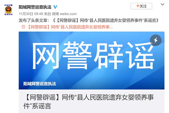 【真相】云南省楚雄市人民醫(yī)院、貴州省盤(pán)州市人民醫(yī)院、河省北徐水區(qū)人民醫(yī)院、山西省晉城市陽(yáng)城縣醫(yī)院等都公開(kāi)辟謠:當(dāng)?shù)夭⑽窗l(fā)現(xiàn)棄嬰,也沒(méi)有發(fā)布過(guò)“領(lǐng)養(yǎng)女?huà)搿钡男畔ⅰ?/p>