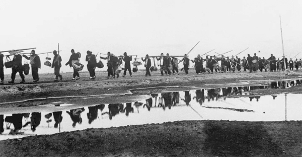 人民解放军以摧枯拉朽之势夺取三大战役胜利,根本原因是我们党同人民一条心、军民团结如一人。图为1948年冬淮海战役期间,渤海区担架民工赶赴前线。 张韫磊/摄