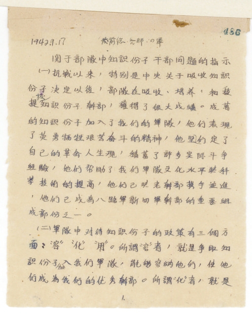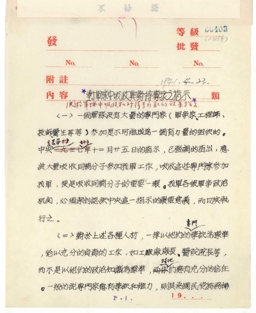 1941年4月23日,中央军委《关于军队中吸收和对待专门家政策的指示》;1942年9月17日,总政治部《关于部队中知识分子干部问题的指示》(中央档案馆藏)