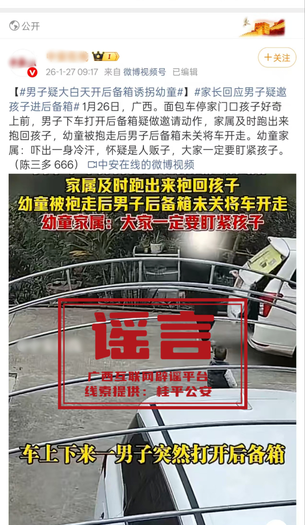 1月底,有媒体及网民发布图文、视频称,“桂平一男子疑打开汽车后备箱诱拐儿童”,引发关注。