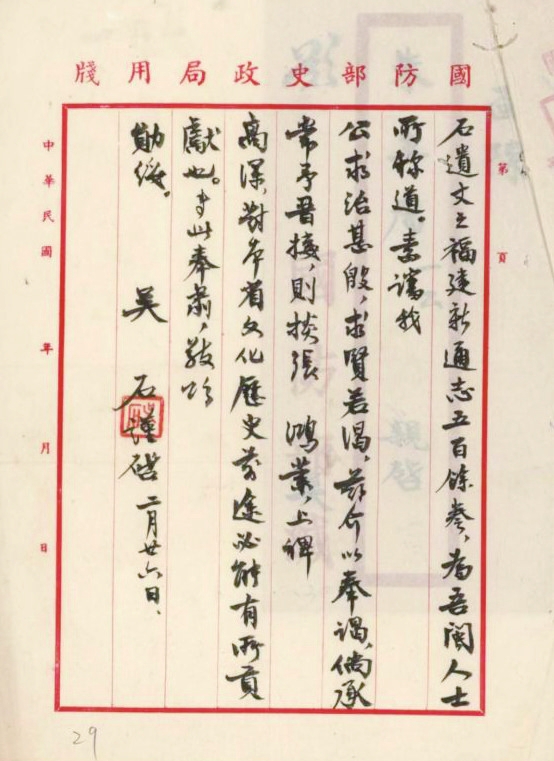 吴石始终将文化传承与民生保障作为重要工作。他始终致力于地方文化传承与人才教育,曾担任私立福州螺洲观澜小学联络员,与陈绍宽等乡贤共同支持家乡教育事业发展。1948年秋,国民政府国防部计划将史政局保存的军事机要档案直接撤运台北,吴石以“进则返京容易,退则转台便捷”为由建议暂运福州,包含“末次资料”在内的500余箱国防部机要档案得以于1949年初运抵福州。1949年6月,吴石密令亲信将这批档案寄存福建省研究院保管,后仅以其中部分档案运赴台湾,使这批珍贵资料留在福建,后成为研究近现代史的重要文献。同年6月,蒋介石密令在福州外围构筑半永久性防御工事,经吴石运作拖延,该计划未能实施,福州城区在解放时免遭战火重创。