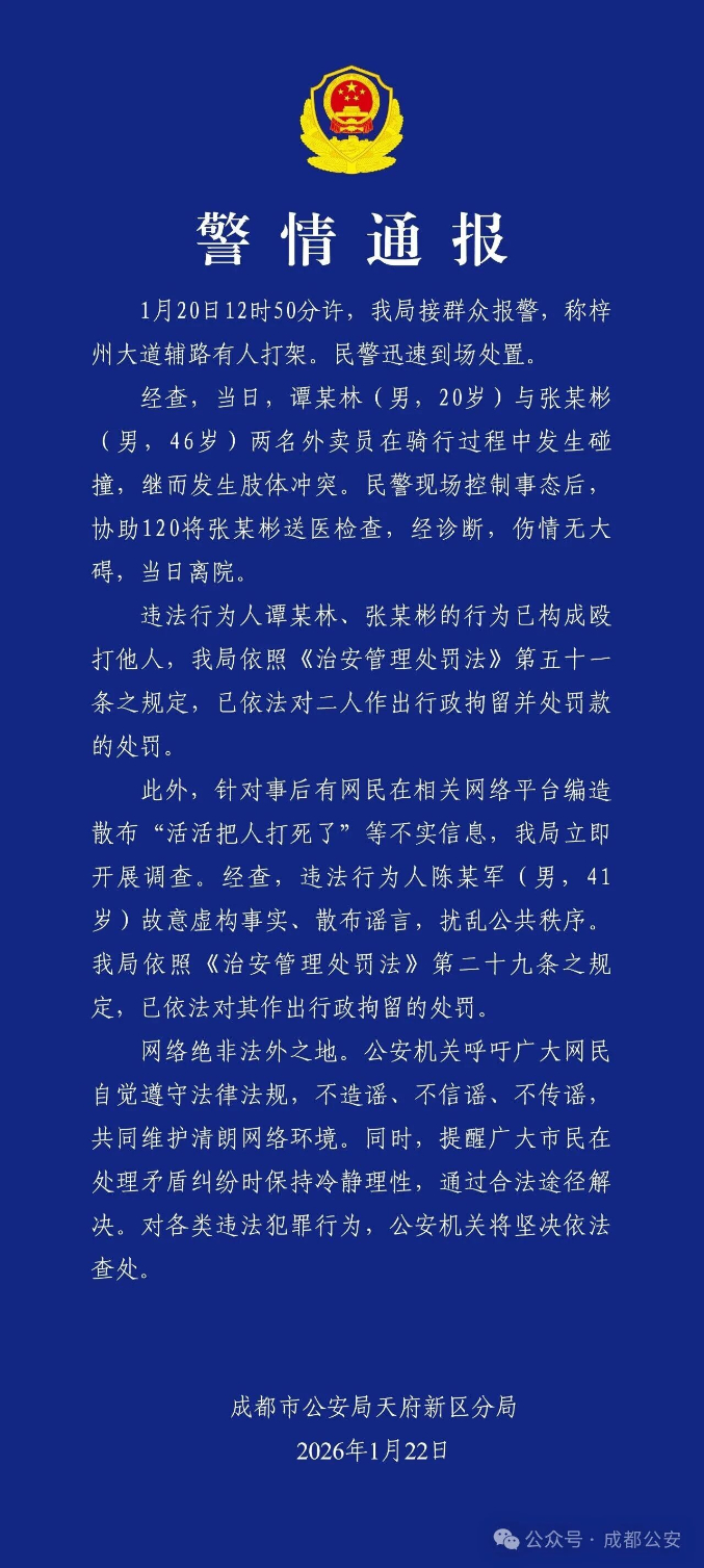 2026年1月22日,成都市公安局天府新区分局发布警情通报: